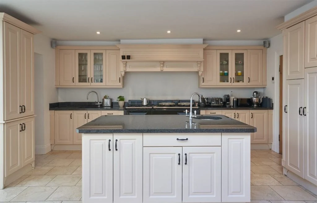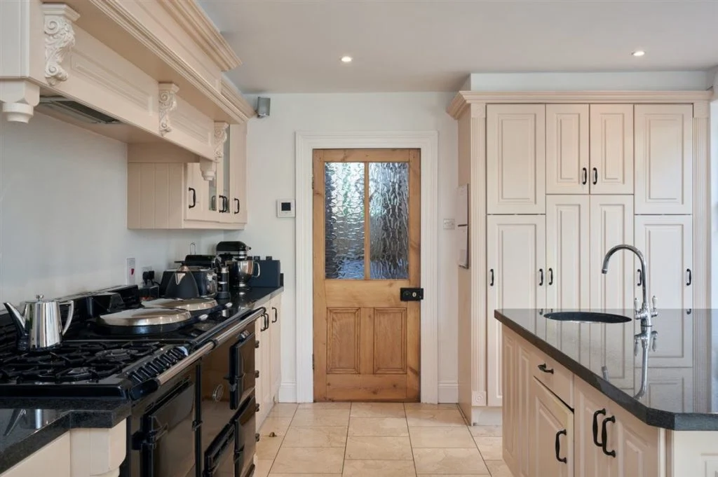 The kitchen is any cook’s dream, with a double-sized AGA cooker, integrated appliances and a fine-sized island unit with a second sink. There is also ample storage space in the range of floor and wall units, as well as display units for glassware.