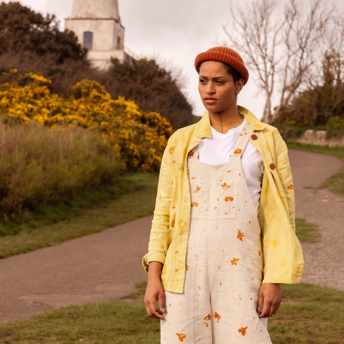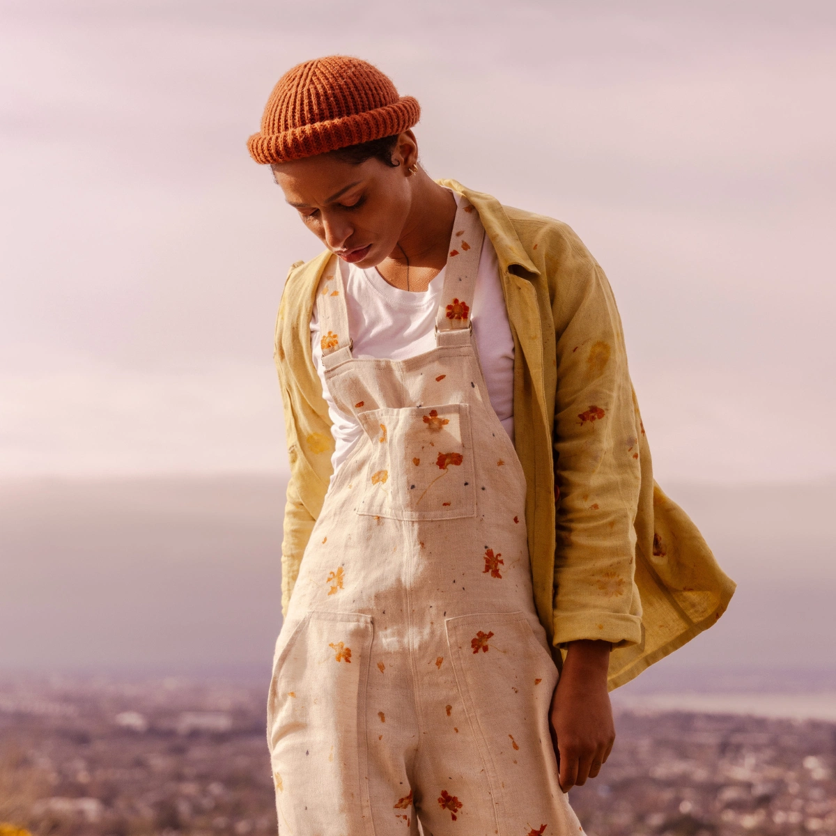 The collection offers a choice of four unisex capsule pieces that can be eco-printed or naturally dyed in a botanical colour or print of your choice, using locally sourced plant dyes and flowers from my garden. The four garment options include; a chore jacket, wide-leg drawstring pants, a loose-fitting shirt with a grandfather collar and a pair of boho-style overalls with adjustable straps.