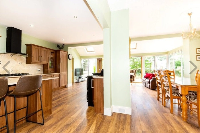 The open plan kitchen-cum-dining room is the heart of the home, with various seating areas and sliding doors leading out to the garden.