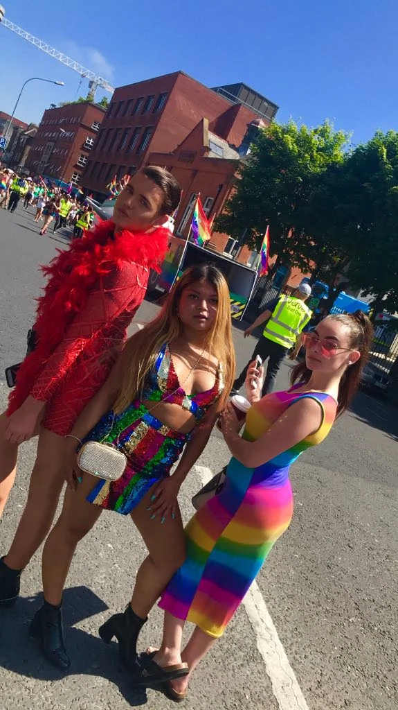 Once we got to Smithfield Square (where the parade’s afterparty was taking place), I was both parched and bursting to go to the bathroom; the reality of an afternoon spent walking out in the sun. In the queue for the toilets I met Celine; a soft-spoken woman in her 60’s from Canada. Celine told me she was in Dublin visiting her two lesbian daughters, a detail which she announced with a huge amount of pride. She said she had come over this week specifically to show her support, which I believed, what with her being covered in rainbow facepaint and decked-out head to toe in pride memorabilia.
