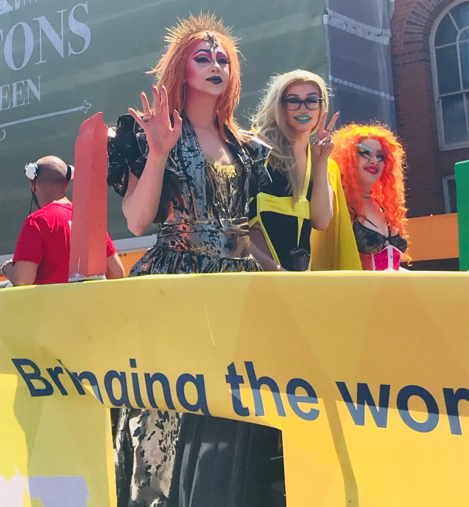 Ear-to-ear smiles, impromptu dance-offs, splashes of colour, glitter and rainbow-clothing in every place I looked, whilst pumping, thumping feel-good chart-toppers rang out for all to enjoy. This was all being overseen by resplendent drag queens who surveyed the activities below from on top their floats. Looking up at the queens, big-busted, heavily HD-browed and donning hair that was often as high as their sky-scraping heels, they seemed like an caricature of Grecian goddesses striding in on bejazzled clouds. They also looked incredibly serene, considering the heatwave we’re currently experiencing, and the fact that a lot of them were wearing leather.