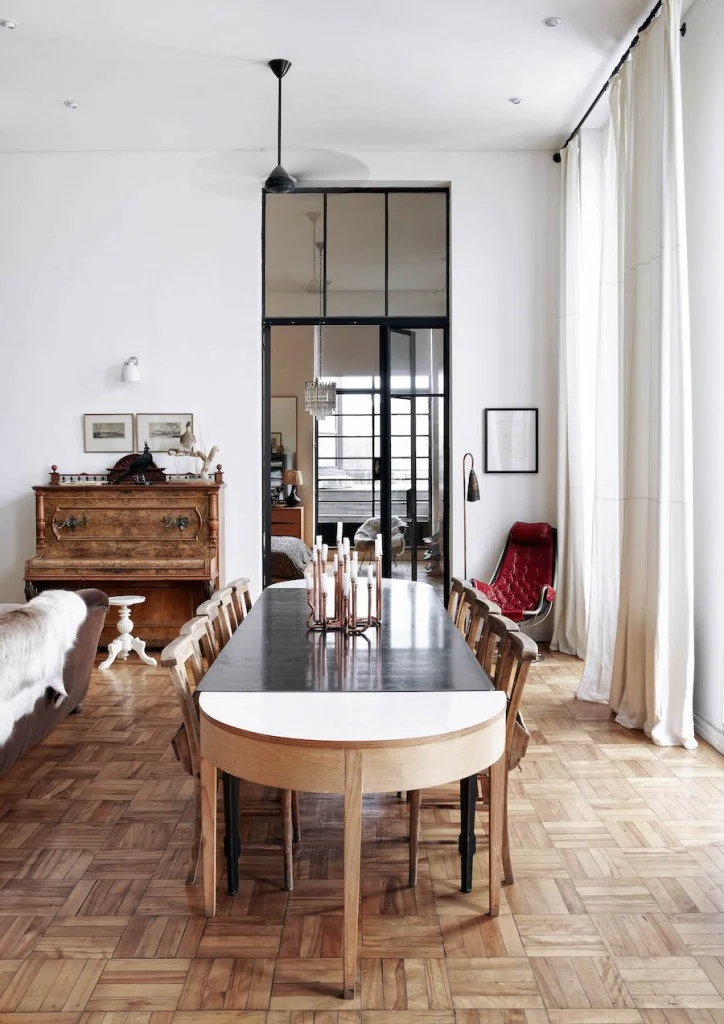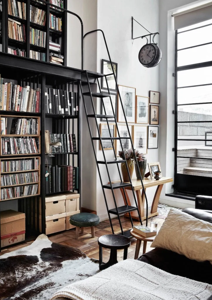 And it is beautiful. Truly. A vast expanse of honey-coloured parquet greets you as you walk through the double front doors with their school-hall glass panels – the first nod to Laureen’s fixation with public spaces. “I wanted the apartment to feel like a smart station hotel,” Laureen says. “And then I saw a picture in a magazine of a steel bookcase with a ladder and a platform, and that fit my idea of the railway station. That became my storyboard for the apartment. What I love about living here is that it’s as though you are part of the city. It doesn’t belong to us alone: we must share it.”