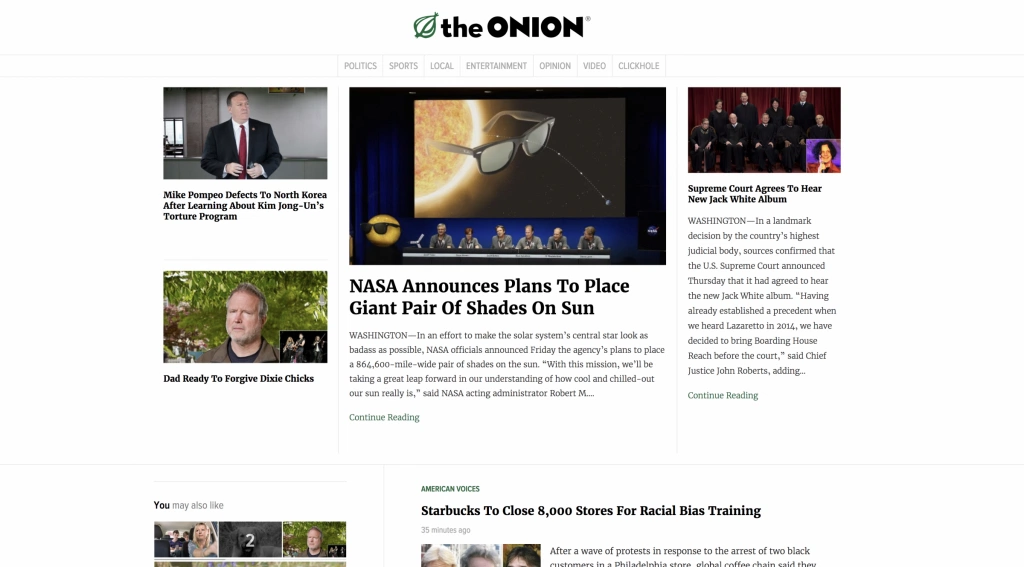 The Onion is arguably one of the most well-known satire websites circulating the web right now. Based in Chicago, the company originated as a weekly print publication in 1988 and started publishing online in 1996. Featuring insightful pop culture commentary, interviews, reviews, features, and other entertainment-related articles – like ‘improvised Kenyan bean picker can’t wait to see what Starbucks has to say about racial sensitivity‘, ‘NASA announces plans to place a giant pair of sunglasses on the sun‘, and ‘Air Wick introduces new piss scented bathroom diffuser‘. This is what the internet was invented for.