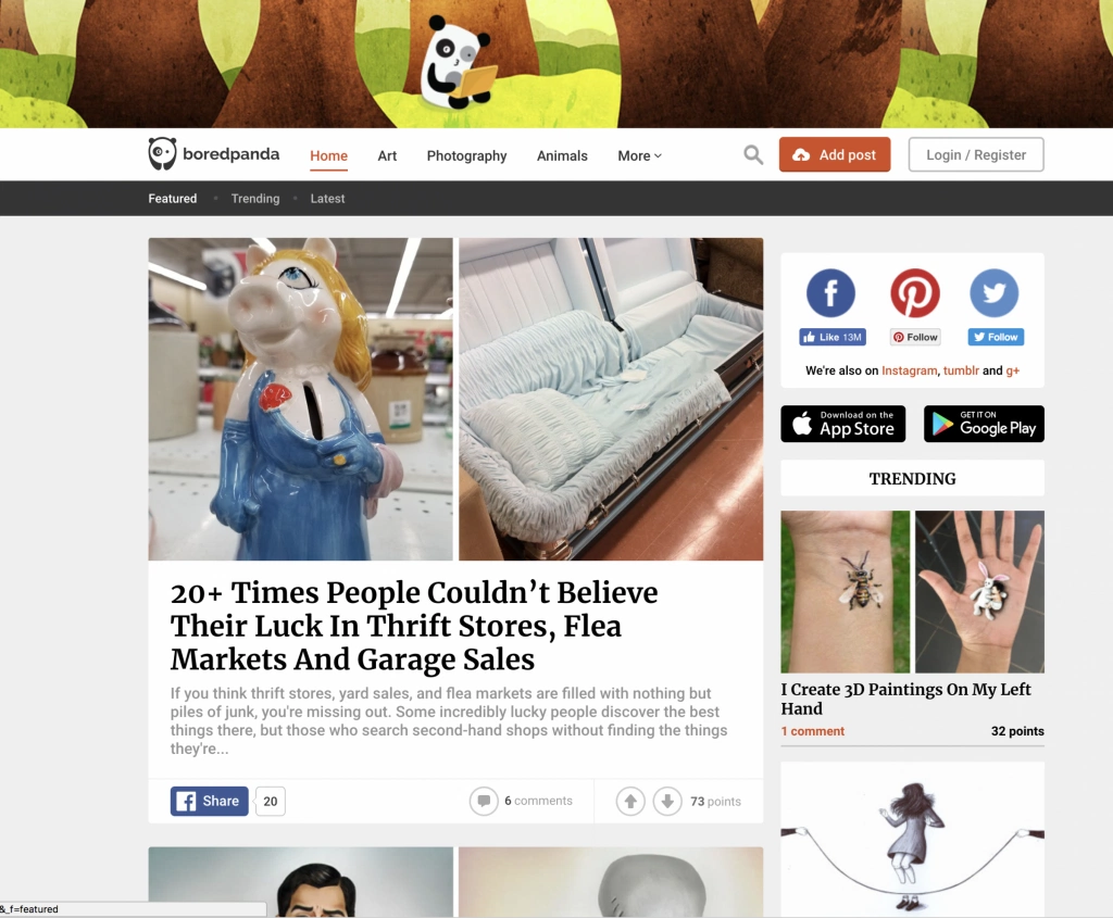 You might recall Bored Panda’s smart, witty and entertaining videos on Facebook (who have accumulated a community of more than 13 million people worldwide). Aside from Facebook though, Bored Panda has been around for quite some time and focuses on art, design, photography, community and bringing creative people together. You’ll find a mixture of relatable, interesting and sometimes unbelievable articles and is perfect for a Sunday afternoon tear-jerker (like this deformed dog who found his forever home, or hilariously disturbing photos of bearded men looking straight up if you’re looking for a WTF moment).