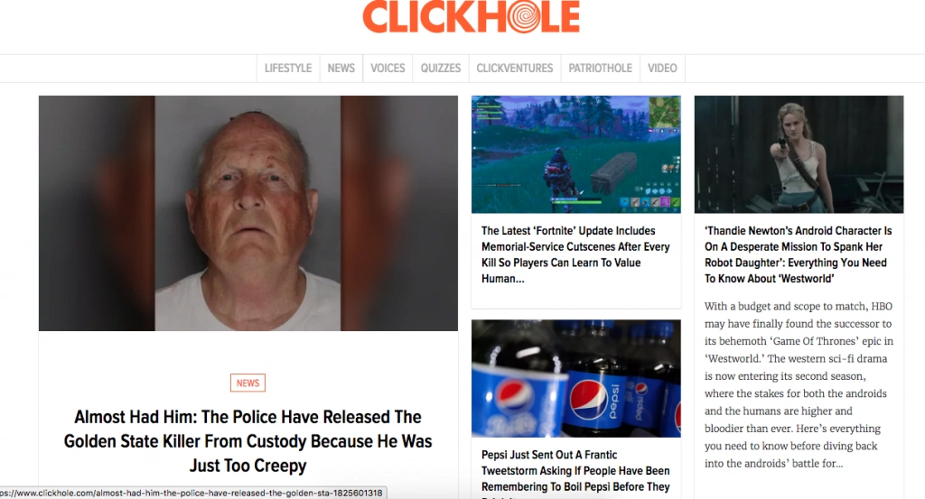 ClickHole is a satirical website from the people who created The Onion. Their tag-line, “because all content deserves to go viral”, sums up what you can expect before clicking. Born in 2014, Clickhole is essentially the Onion’s younger brother which clearly parodies Buzzfeed (even down to the colour-scheme). Expect “news”, quizzes, click-bait of the highest calibre like “of course Margot’s only skin routine is splashing her face with water at night”. The Guardian newspaper has questioned whether the articles are “a satire of clickbait or good satire done as clickbait”, but we’ll let you decide.