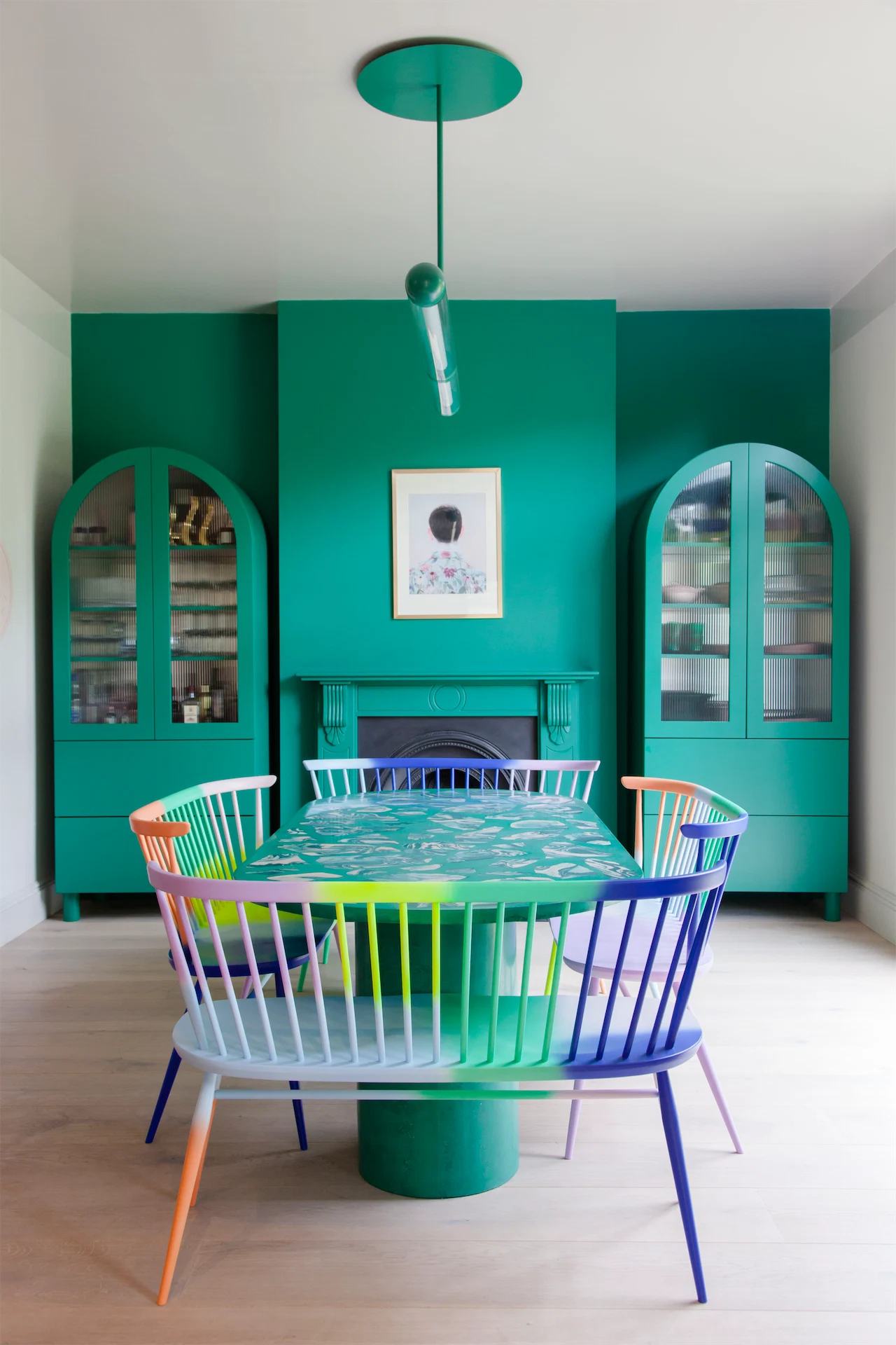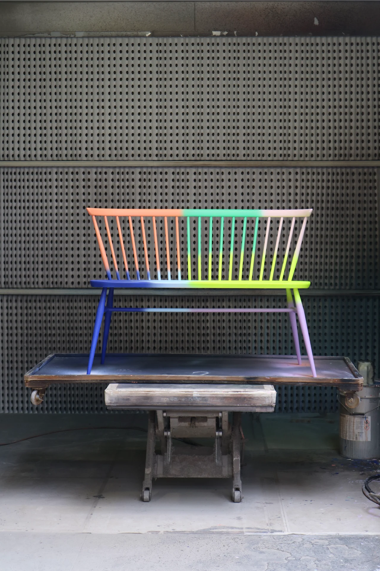 “We wanted to make this piece for Pride, as equality is so important to us, and so we took the base idea of the rainbow and gave it our own contemporary take, pastels and electric blue and neon yellow,” the duo explains. Each piece has been hand-sprayed in the 7-palette rainbow of hues in the Ercol factory by their master sprayer.