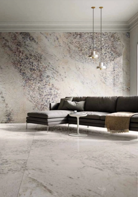 These gorgeous Gemstone Maxfine tiles are inspired by the world of minerals, featuring extra-large sizes and a variegated texture that alternates crystallised areas with more homogeneous areas. These tiles come in three different colours and will embellish any surface.