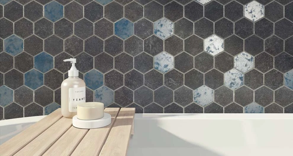 Be the envy of your friends with these cool cement-effect tiles lining your bathroom walls. Why not incorporate them into your floor pattern to create a full flow?