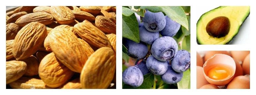 ALMONDS Magic vitamin E, which is abundant in almonds, most leafy green vegetables and, for topical use, comes in an oil, will visibly improve your hair quality as it stimulates circulation, growth and nourishes capillaries. It’s also your split ends? best friend.