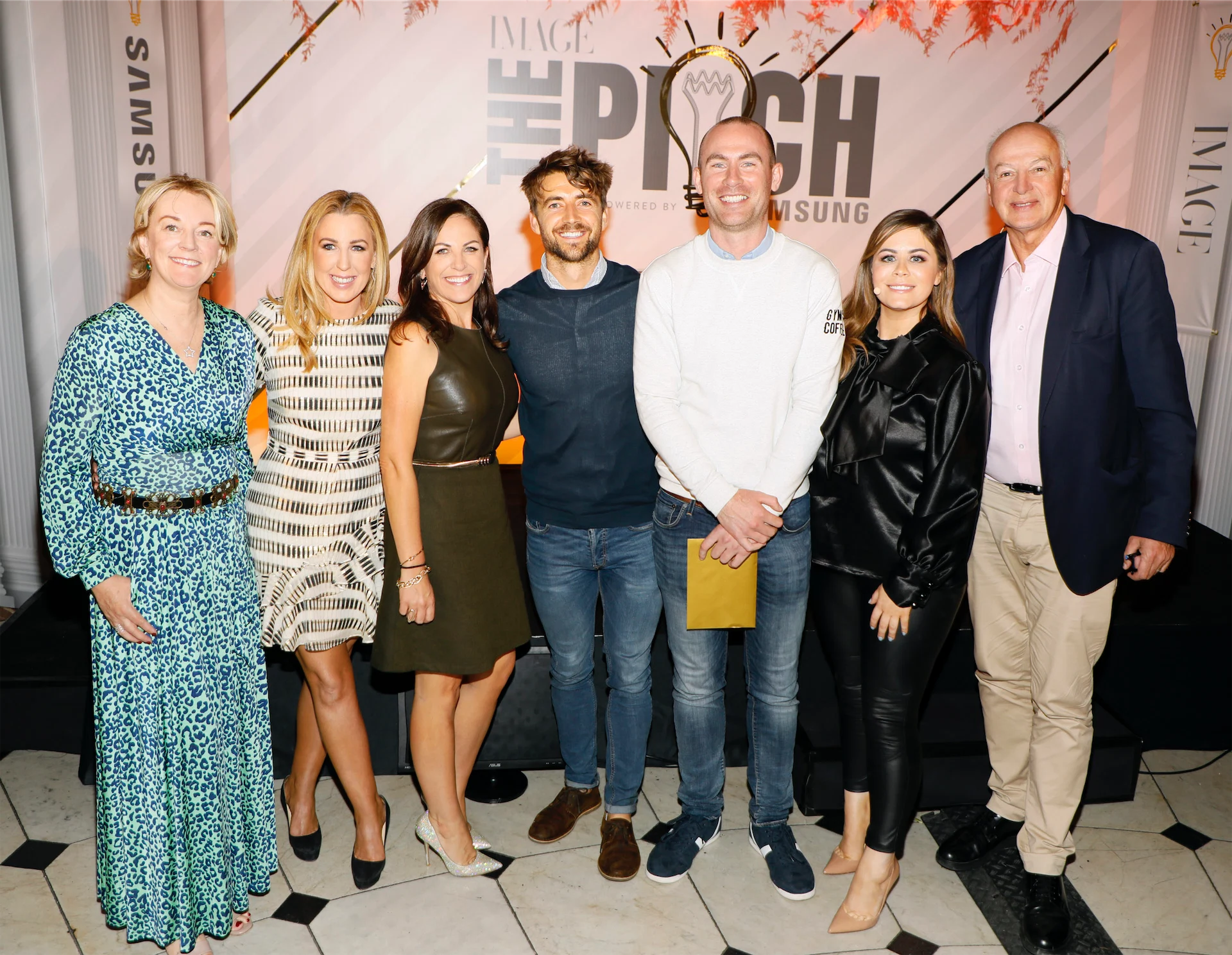 Karl Swaine and Diarmuid McSweeney with The Pitch judges, from left, Jo Malone, Clodagh Edwards, Linda Nolan, Jennifer Rock and Bobby Kerr. Photo: Kieran Harnett
