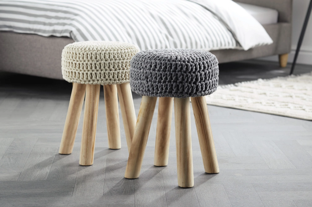 Practical and stylish, these knitted stools add another element of texture. Available in cream and grey.