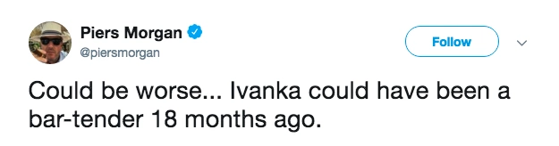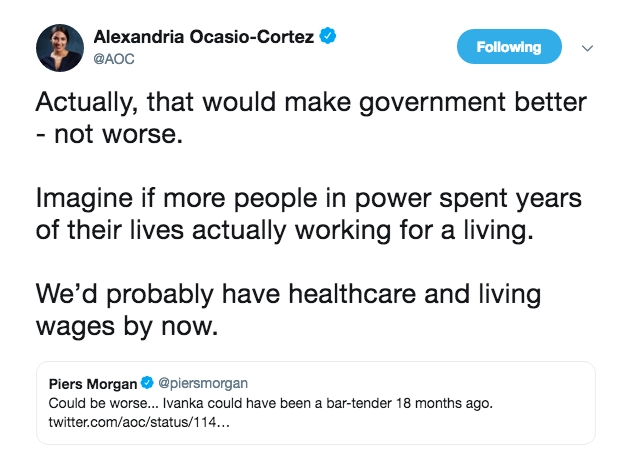 Perhaps the most frustrating response to Alexandria’s post was from Piers Morgan who stated: “Could be worse…Ivanka could have been a bar-tender 18 months ago”.