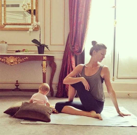 Gisele Bundchen is known to practice yoga, and often takes pictures of herself practicing at home or on holiday, often with her super cute baby she had with hubbie American football player, Tom Brady. Images from Gisele’s Instagram.