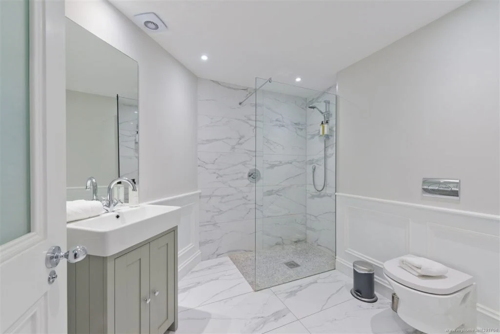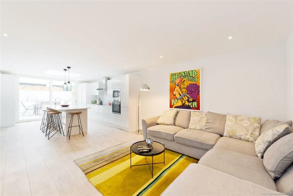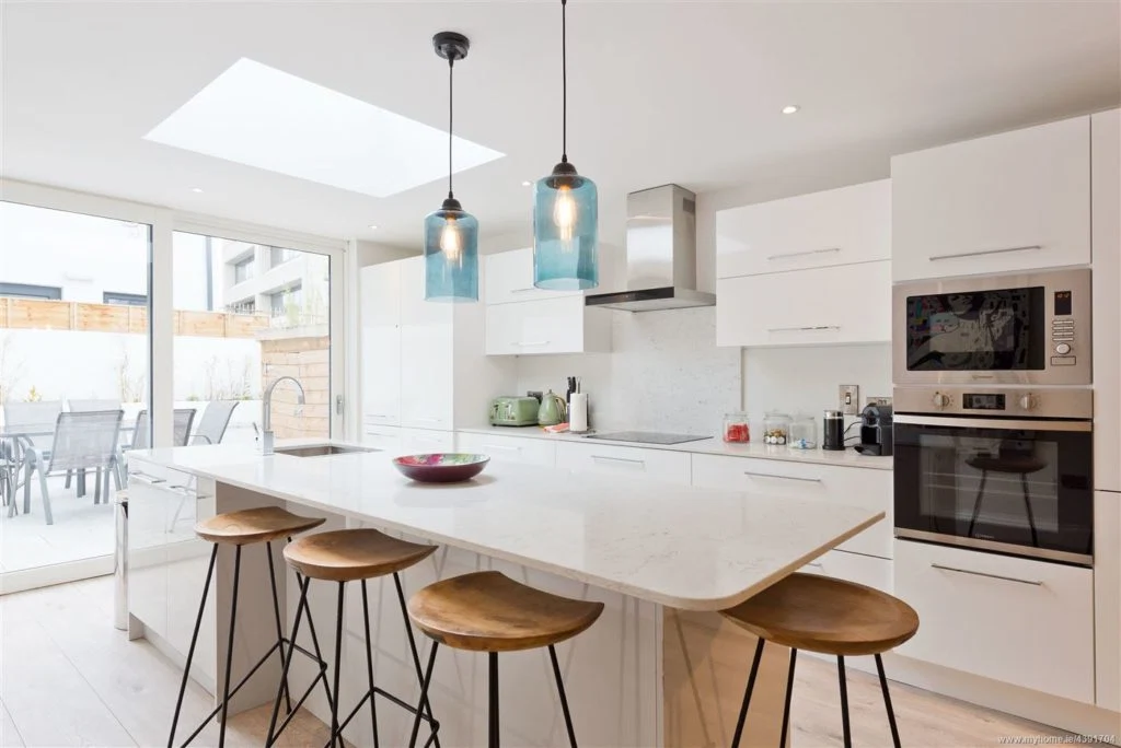 Towards the rear, you’ll find a fully-equipped kitchen, with features including a centre island, marble countertops and a marble splashback. There is also a washer/dryer, double oven, hob and extractor fan. Glass sliding doors, which lead out to the garden, add lots of natural light, as does the skylight overhead.