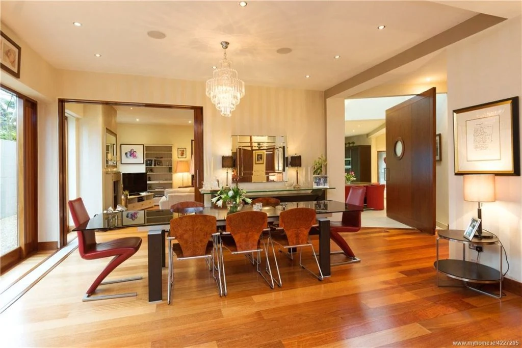 From here, you can pass through to the formal dining area, where there is currently an eight-seater table, ceiling spotlights and chandelier. There are also speakers which connect to the property’s built-in Bang & Olufsen sound system (adding a wow-factor to any dinner party).