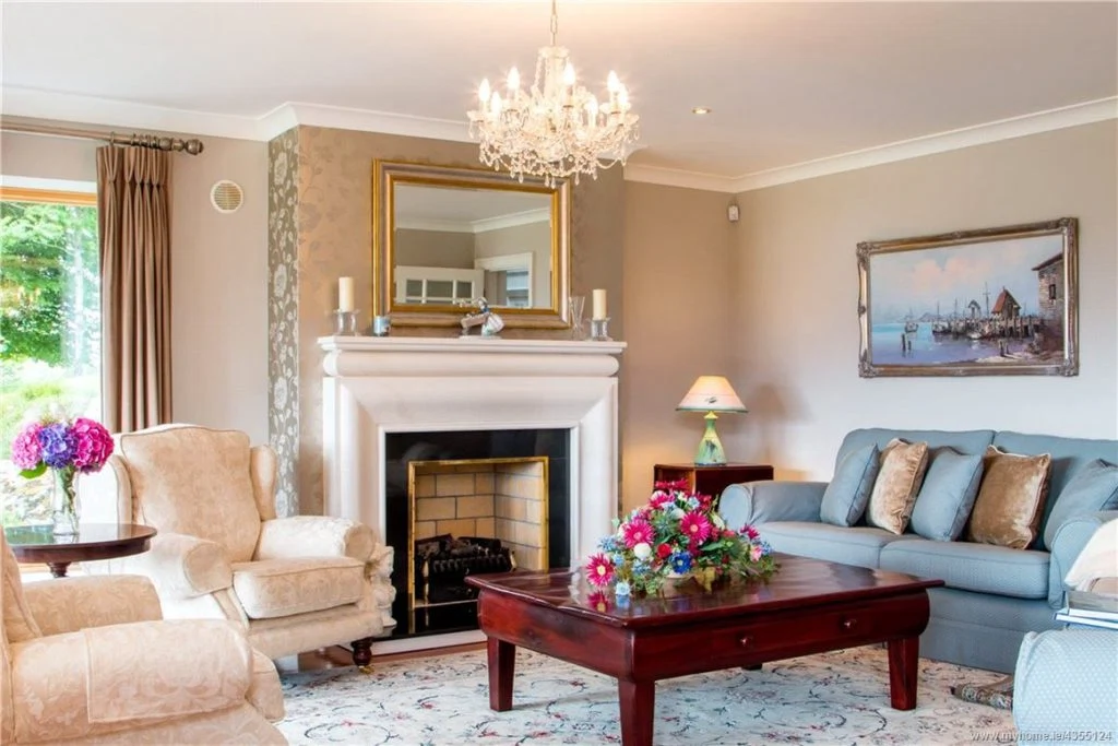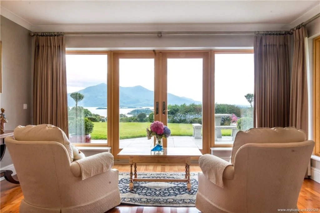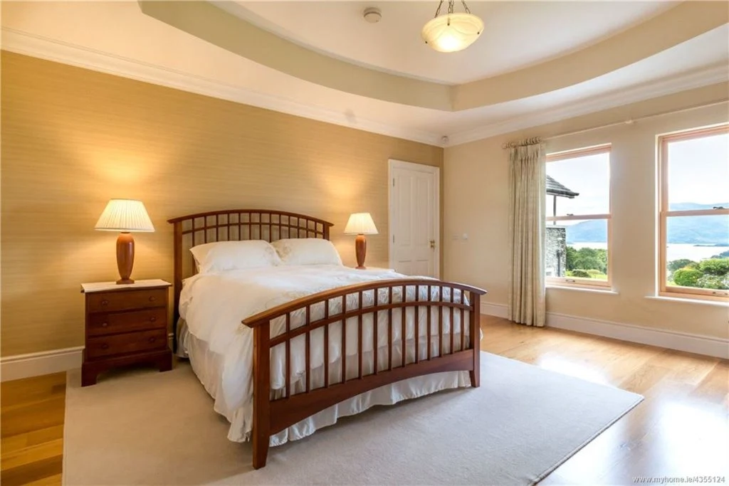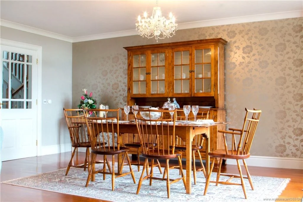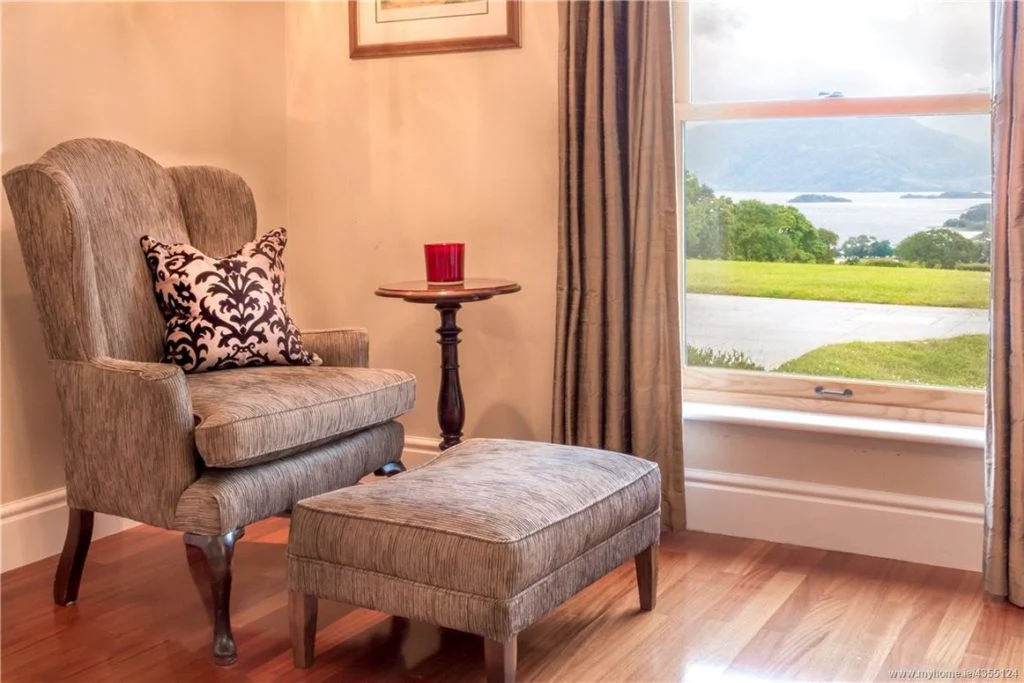 The formal dining room comfortably seats six people and overlooks Lough Leane and the McGillycuddy Reeks. Current owners have styled the room with elegant wallpaper, a chandelier and luxurious rug.