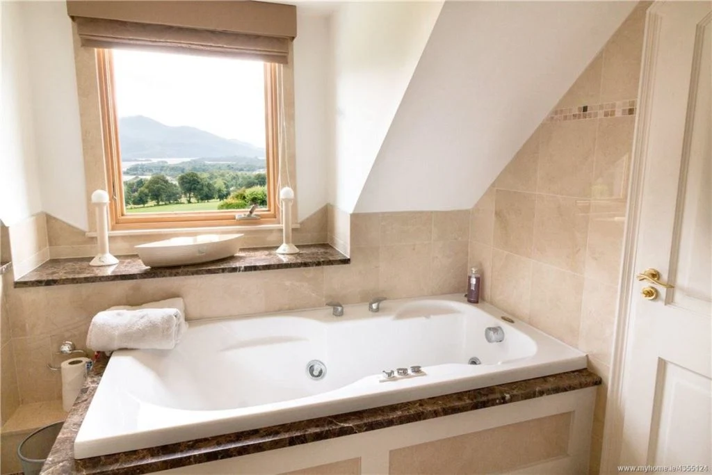 As with the majority of the house, the main bathroom offers beautiful views across the lake and mountains.