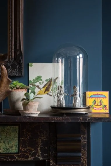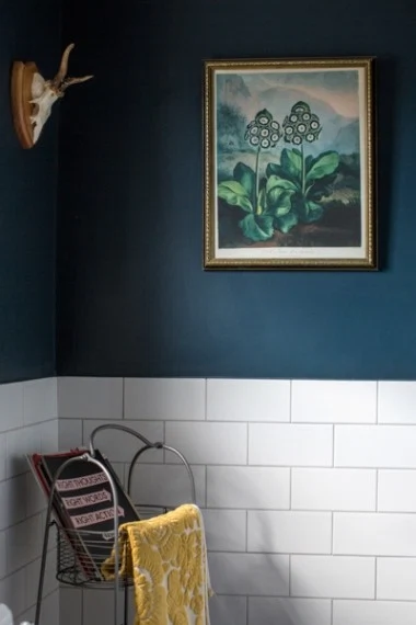 The house is totally transformed. Out is the bubbled blue wallpaper, and in are gorgeous dark hues of Farrow & Ball. Spot Hague Blue in the living room and bathroom, Downpipe in the bedroom and Plummet across the woodwork. Wendy explains, “It’s a dark house so we thought rather than trying to make it light with light paints – and it just being a bit shadowy – we said we’d embrace the darkness.”