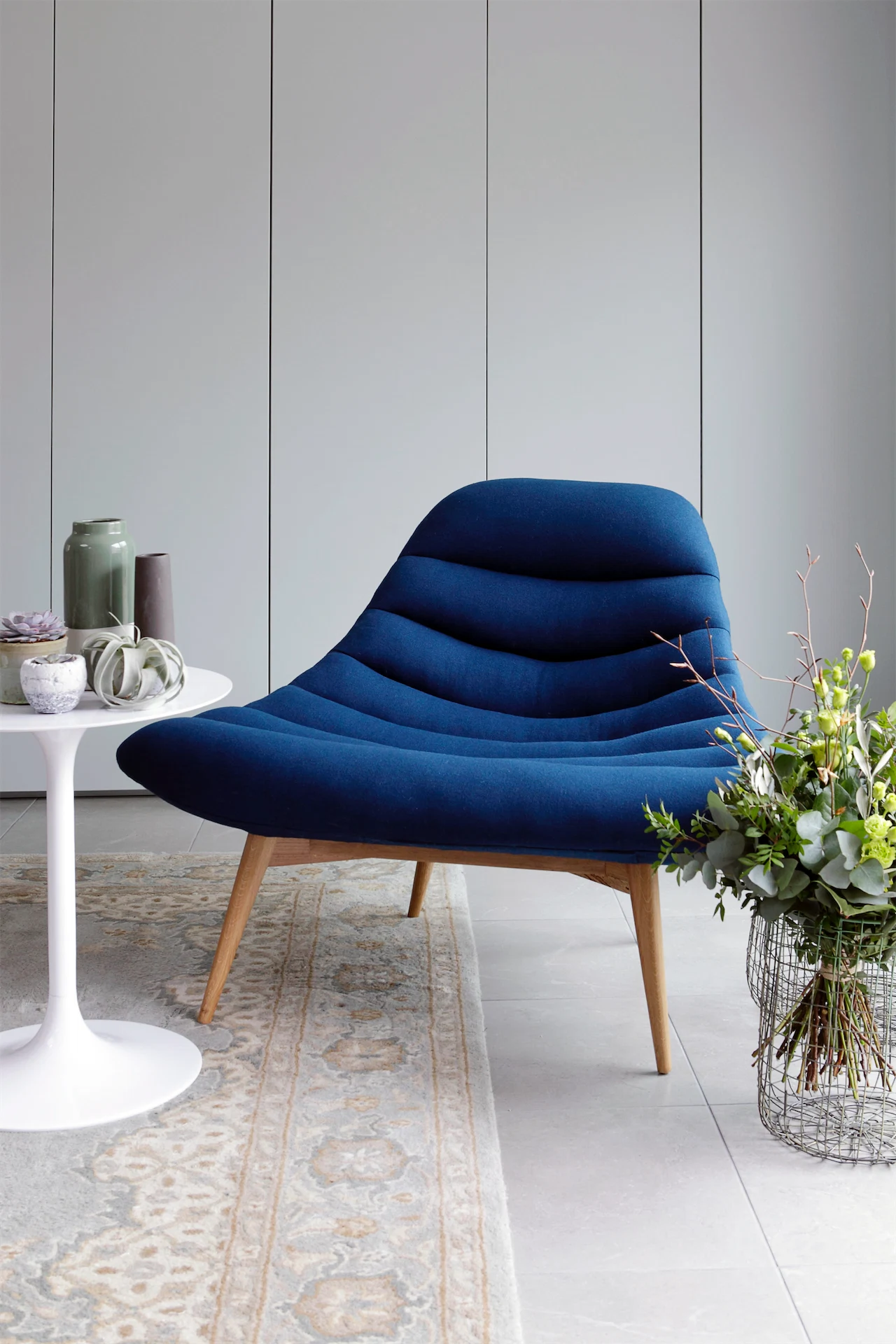Navy leather French Connection Zinc cuddler from DFS with cushions from Article. The side table is CA Design