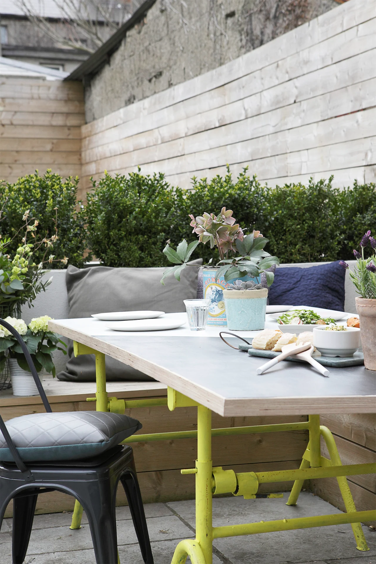 A custom-made KLD table is surrounded by Tolix chairs from Industry, cushions from DFS and Ikea. On the table, bowls are from Dunnes Stores, while the cutting board and salad spoons are from Article