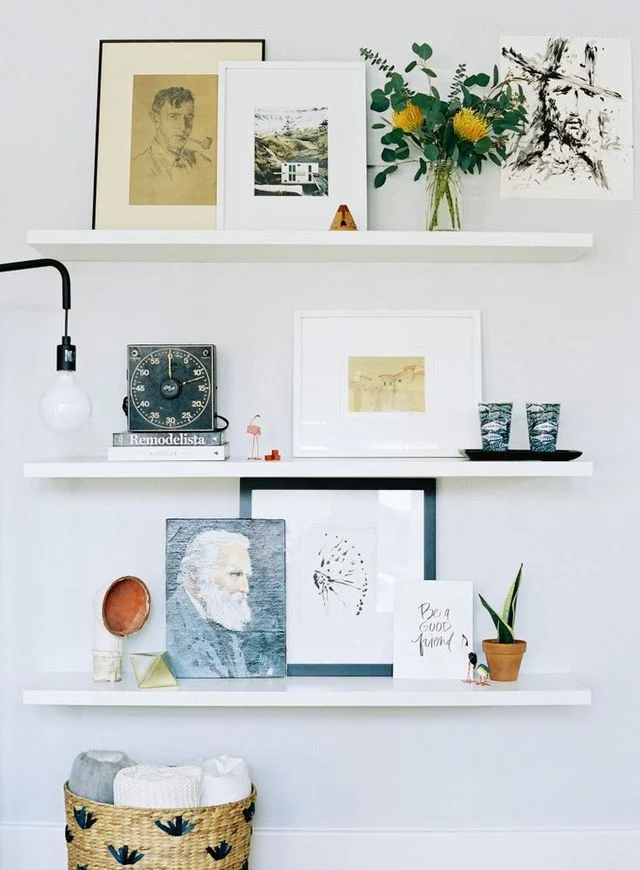 This works great for framed pictures. By alternating heights and sizes, you are thinking about the display as a whole. If you’re unsure, use the border of a shelf as an anchor for your creation.