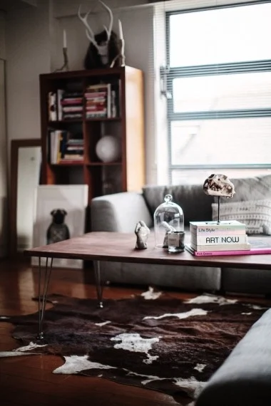 TEXTILE-TASTIC The building itself was once a factory that manufactured school uniforms and leathers. Pretty perfect for Jen. ?I’m very obsessive about textiles, so – while Dan’s better at colour – textiles is definitely my thing.??Their home is strewn with luxurious animal hides, shearling, antlers and animal-inspired art. Growing up, Jen wanted to be a zoologist. ?I have a fascination with biology and the workings of animals,? she begins. ?I work with a lot of leather and animal by-products, so I get a lot of samples.? These often end up draped over a chair. ?They’re all coming from the same spot. I’ve always had bits of off-cuts lying around and one thing tends to influence another. My home is totally inspired by my work.?