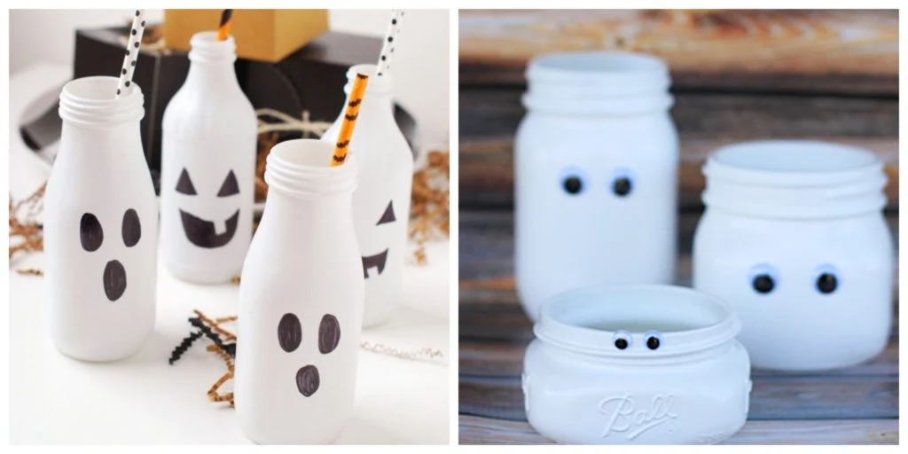 All you need here are a few glass bottles and jars, some white and black paint (or a pack of googly stick-on eyes), and you’re good to go.