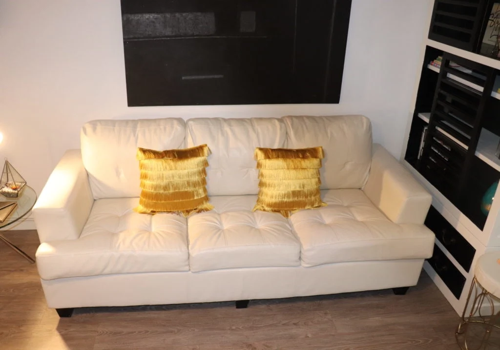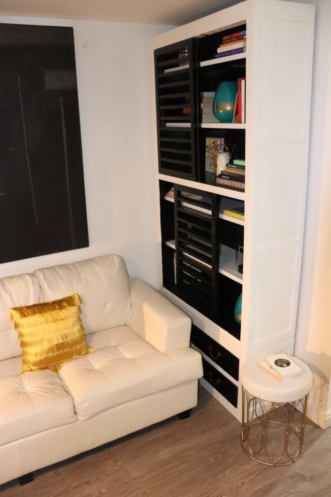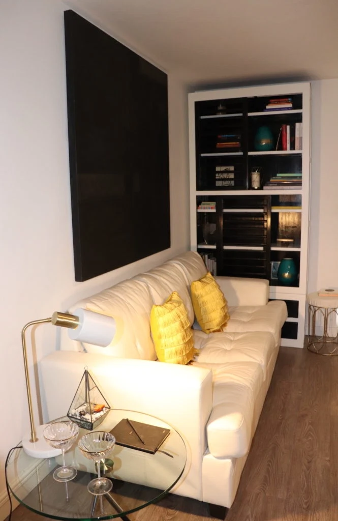 “As for the furniture,” Natasha continues, “the bookshelf is from Restoration Hardware in Los Angeles. I felt it was too harsh against my colour scheme, so I got it painted white along the borders.” This bookshelf is tastefully positioned alongside Natasha’s designer couch/couch-bed, which “I imported from Los Angeles, and is fantastic for when guests stay,” she says.
