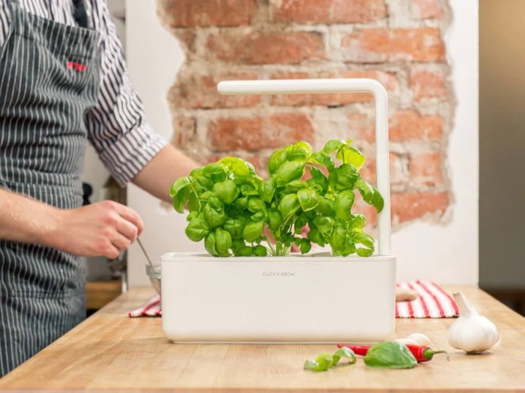 Its sleek design means it fits neatly onto a kitchen counter, coffee table or windowsill; while its smart soil allows owners to grow their own basil, peppers, tomatoes and peas.