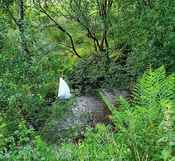 Mr Smyth located the plastic bag hanging from a strand of barbed wire at the top of a fence and proceeded to perform a specialist rescue. He knew that if the bag became detached or ripped, the animals inside it would likely drown in the fast moving water below.