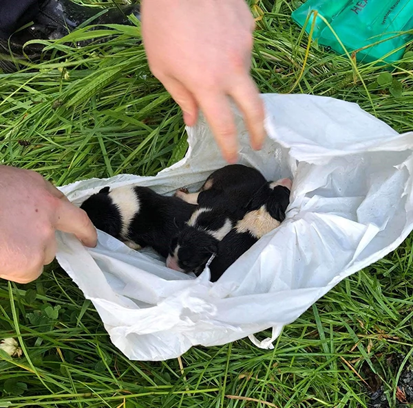 The puppies were found dumped in the bag and left for dead while dangling over a river near Drumkeen, on the Ballybofey to Letterkenny route on Wednesday night.