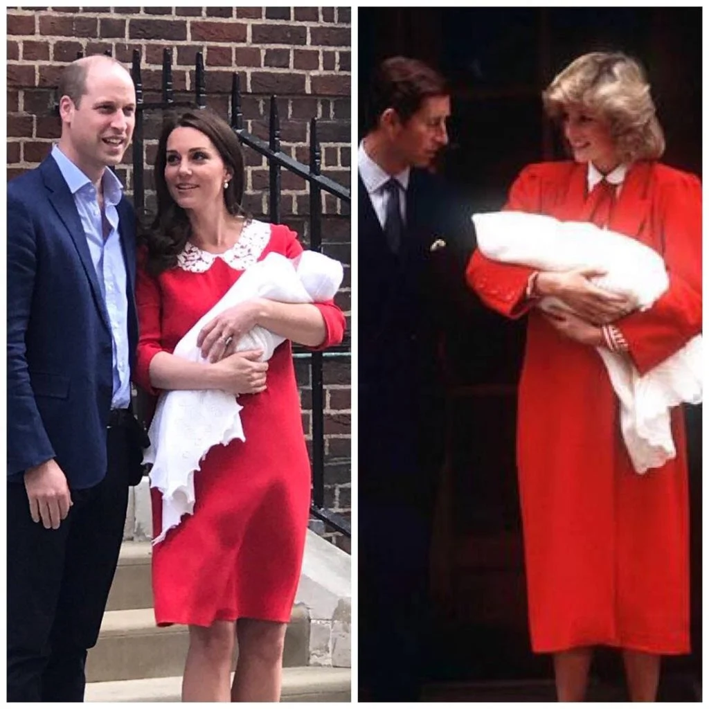 Upon closer inspection, the Duchess of Cambridge’s outfit is very similar to the one Princess Diana wore 33 years ago, when she presented Prince Harry to the world. Her red Jenny Packham dress with its white lace collar is reminiscent of her late mother-in-law’s long red coat, with accompanying white collar blouse.