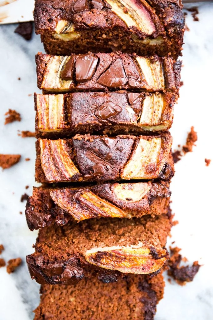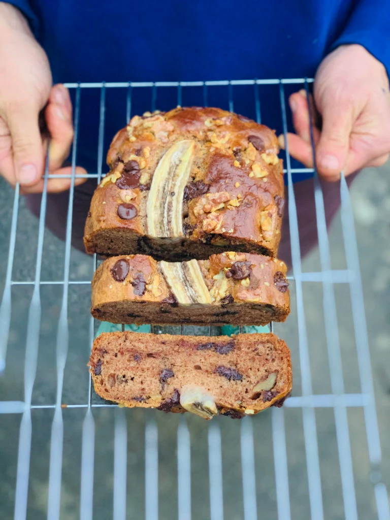 - For decoration if you want you can cut a banana lengthwise in half and put on the top of the batter to caramelise in the oven, add a few extra choc chips on top before baking too for an extra indulgent-looking banana bread!