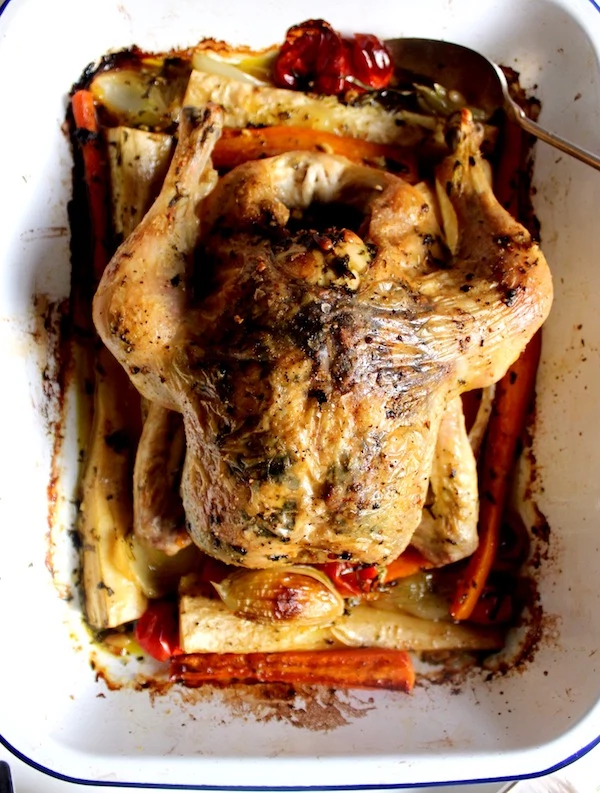 Roast chicken has always been one of my favourite dinners. Whether it’s a Sunday lunch feast or just a casual roast chicken with a crunchy salad, it always satisfies. It’s so easy to stick with the same recipe time and time again, but it can be a little boring, so I like to spruce it up a little and play around with different seasonings. This recipe is such a winner, and it’s barely any more effort than your everyday bird. The layer of fresh pesto beneath the crispy skin tastes incredible, as do the roasted root vegetables that are flavoured in the fragrant basil, too.