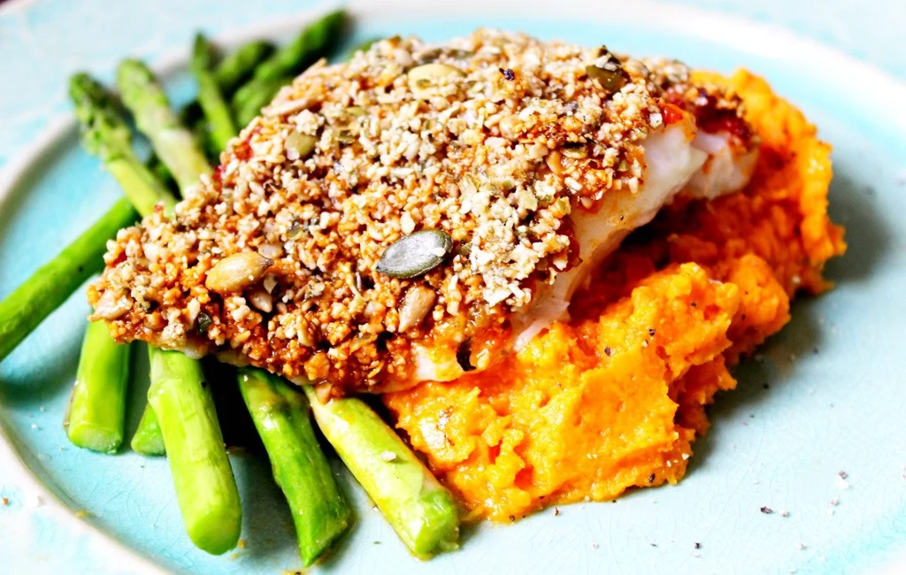 Step 5:?Bake at 180’C for about 13 minutes, until the fish flakes easily with a fork?and the seeds and golden and toasted. I served mine with mashed sweet?potato and roasted asparagus.