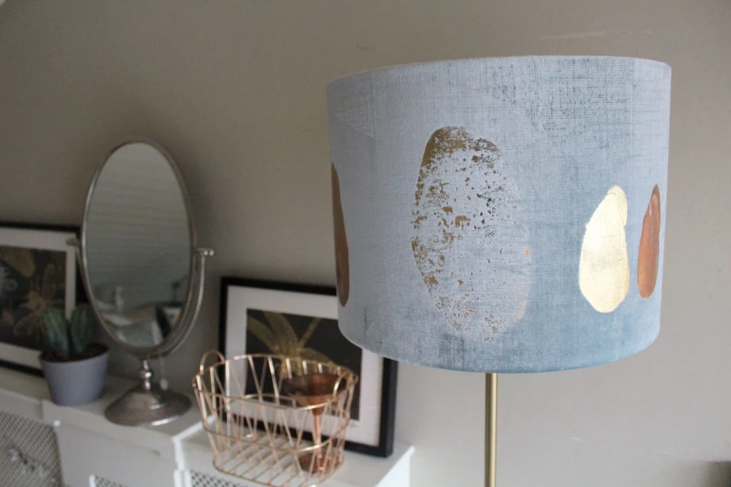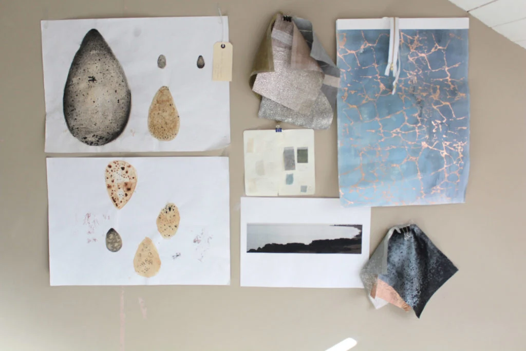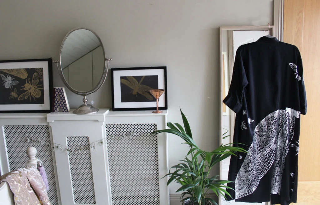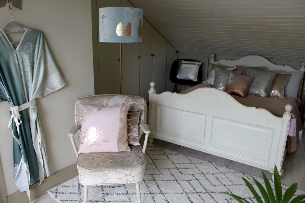“My textile designs focus on a very tonal colour palette; working with muted hues that contrast with the flecks of metallic in my handprinted fabrics. I like the combination of soft blues, powdery pinks and calming greens I have used within my space.