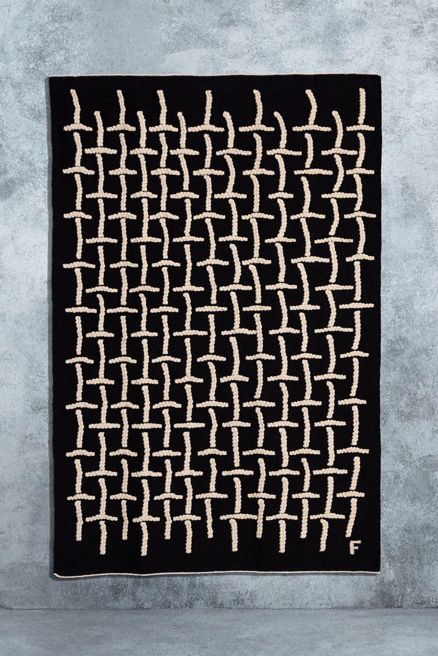Polish graphic artist Filip Pagowski considered a rug’s actual making as part of his design. “The idea behind the design was the notion of weaving,” he says, “with the image reflecting the mechanics of using yarn to build a rug.”