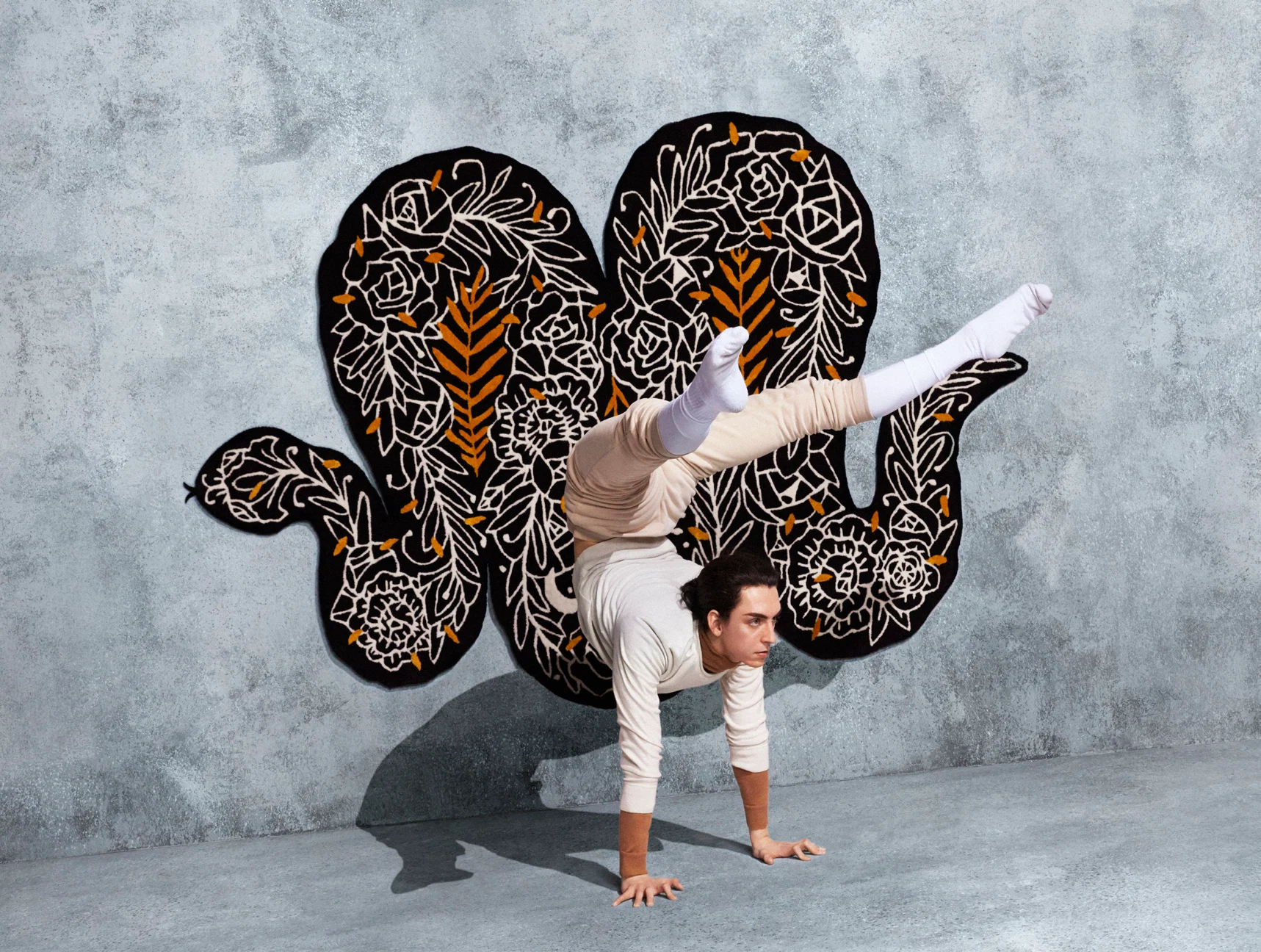 French artist Supakitch is influenced by rhythm, tattoos and Asian manga and these are drawn out in his snake design. using the classic animal hide rug as his starting point, he opted to give it a fresh take with a slithering snake. “As a totem animal, the snake is a spiritual guide that heals,”he says. “Snakes shed their skin and symbolise rebirth.”