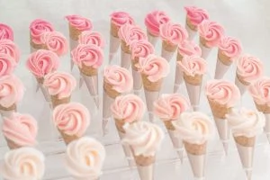 NOTE If you like, you can use ice cream instead of buttercream for the rosettes. Just make sure the ice cream is fairly thick (not runny). Arrange the filled cones in the acrylic tray, pipe quickly and then freeze immediately.