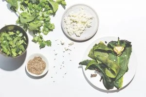 Put the poblano chillies, cumin, coriander, mint, feta, lemon zest, lemon juice, garlic, vinegar, and salt in a blender and pur?e on medium to high speed, adding water a tablespoon at a time, until smooth. Use just enough water to blend the mixture to the consistency of hummus. It shouldn’t be too liquidy. Store in a covered container in the refrigerator for up to 2 days.
