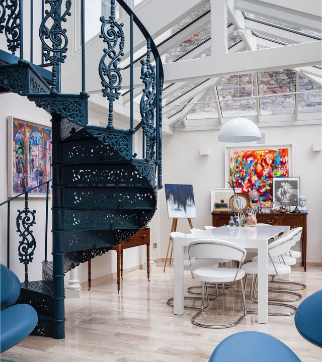 People visiting always say? “I love this spiral staircase….”?It is a really strong feature in the space and always grabs people’s attention when they enter. It links the hallway to the large extension so it is one of the first things people see. Sourced from a local salvage yard, we customised it so that it would fit into the space and had it painted in a rich petrol blue, which showcases the intricate detail well. It is the main feature in the space and divides the living and dining area.