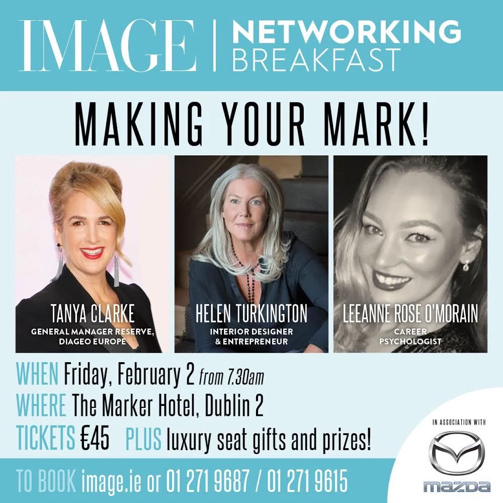 Hear Helen and fellow panelists, General Manager of Reserve brands with Diageo Europe – Tanya Clarke and Leanne Rose O’Morain – Career Psychologist, talk about ‘Making Your Mark!’ at our Networking Breakfast, Friday, February 2nd.