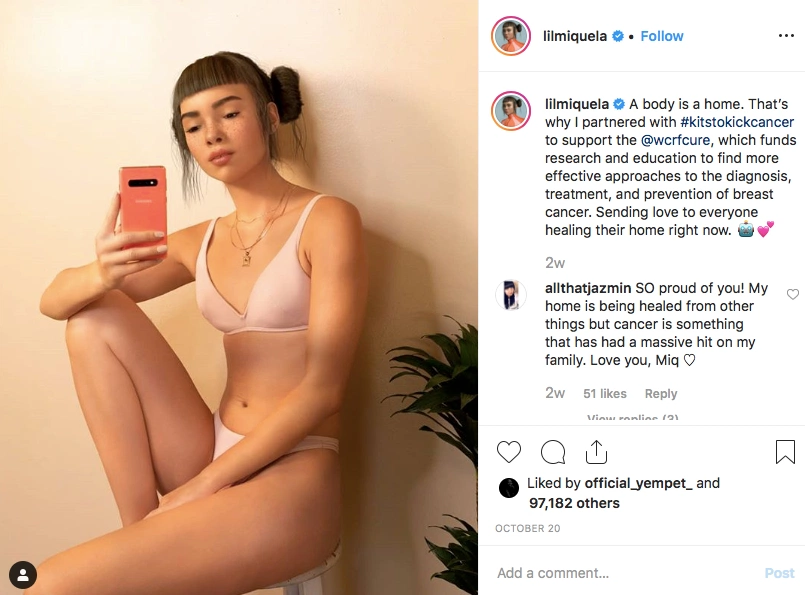 “I love you, Miq” writes one fan. Another comment under a picture of the CGI character posing in underwear for cancer charity says “I wish I had a body like this’. A fan writes; “This might sound weird, but your body looks so soft.”
