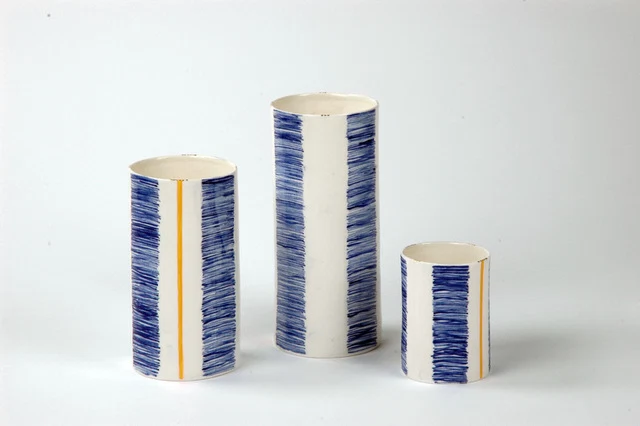 It’s easy to see both the contemporary and historical influence in Rebecca’s work, so it’s not surprising then that, after graduating in fine art from the University of Ulster, she spent some time with the venerable?Fermanagh?brand Belleek Pottery (established 1857) and later with the International Ceramics Research Centre in Denmark. Nowadays, she’s found creating these cylindrical containers in her studio in Newry.