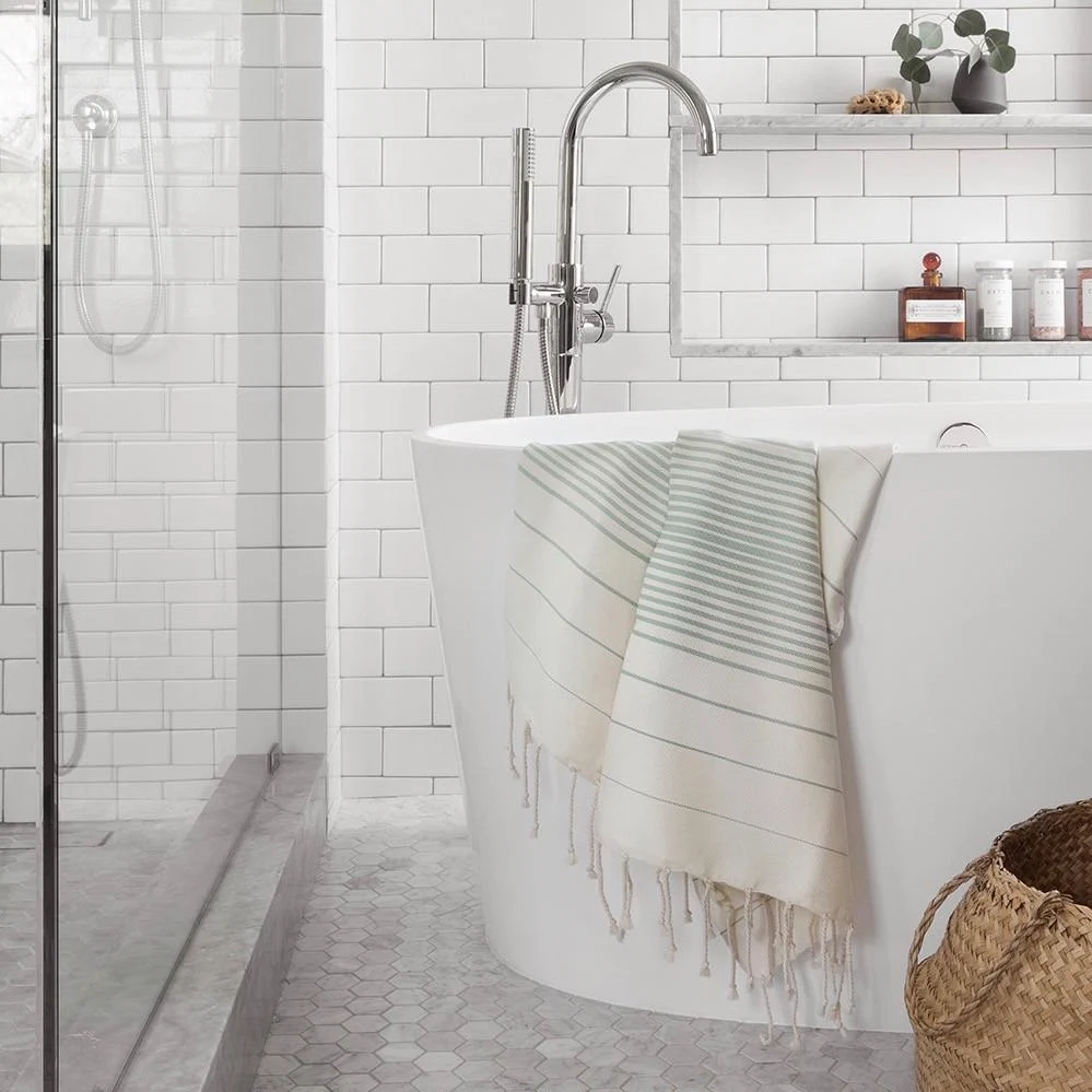 Not one to follow trends, but can’t help falling in love with the colour? This cream white towel with mint green stripes is a subtle, and private, way to bring this colour into your home.