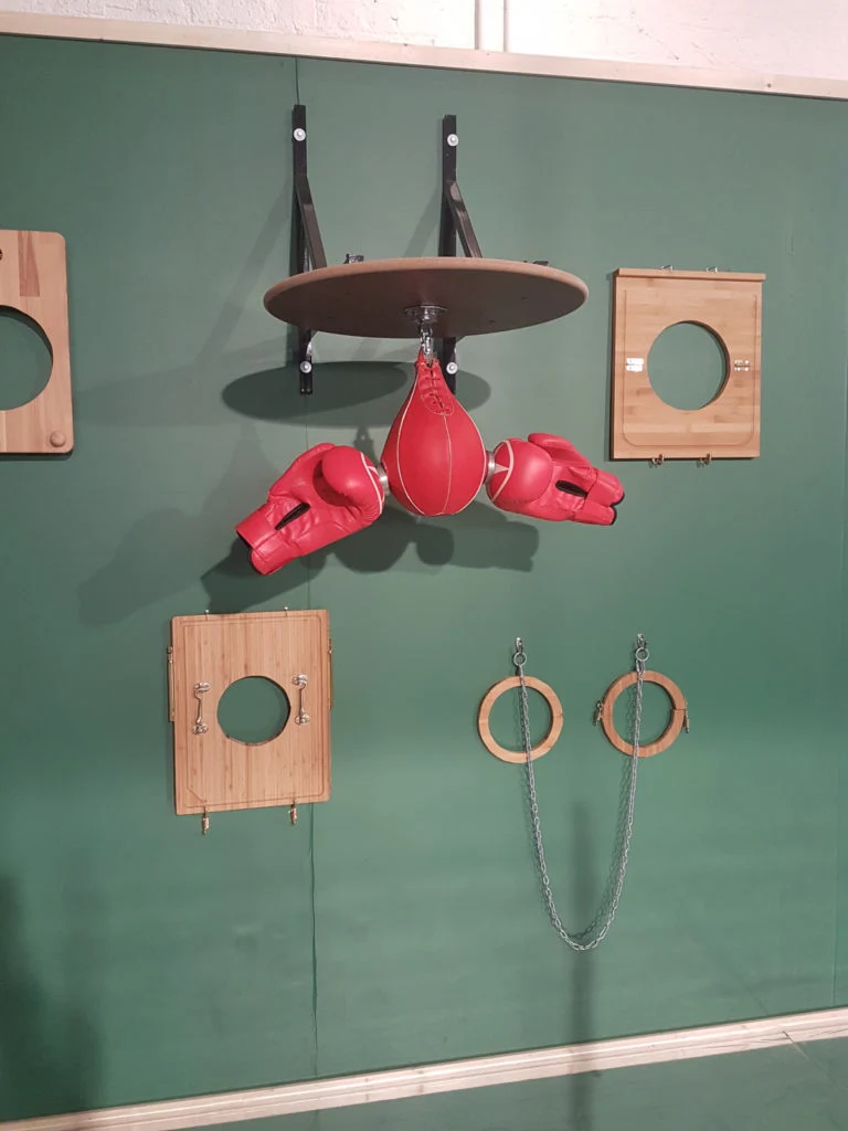 As we move towards the Sculpture creations, an element of performance makes its way into many of the finished works. Whether it’s a live TV stream of animated eyes on a hospital bed, or a dress made of sanitary towels and tampons to protest the societal stigma around menstruation, the works come alive around the room in front of our eyes. One student, Elayne Harrington (or Temper-Mental MissElayneous, as is her stage name) is as much a part of her exhibition as the physical props. Her work, entitled ‘Instrumental’ explores the ideas of the working class, the eight hour work day and the appropriation of working class labour and produce. Everything, from the chalk board background, to the IKEA furniture to her own raw ideas scrawled across the wall in industrial chalk, feeds into her motivation for the piece. Elayne explains “I’m combining the experience of academia as a working class access student, with all the essence of working class culture, which stems from where I’m coming from socio-economically, and putting that skill into this environment.”