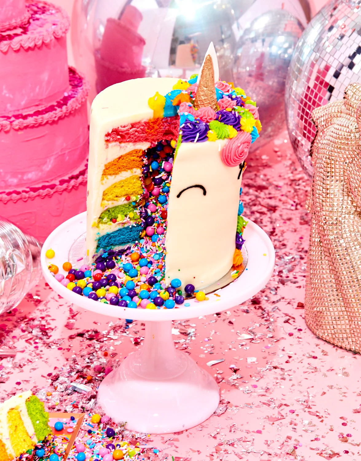 Make the horn: Paint the ice cream cone gold using your edible gold paint. Next, make the white chocolate ears: Melt the white chocolate, then form the melted chocolate into big teardrops, about 5cm tall. Once the ears have cooled, flip them over so you have a flat surface, then use a clean paintbrush to paint on a little oval in the middle of the round part of the ear with the edible gold paint. With your fully cooled cake layers, build your cake using the how-to in note 3 as a guide. Don’t forget to add the sprinkles and stars to the centre, for the explosion! Cover the cake in white frosting and coat with white nonpareils, if you’d like.