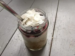 Once the water has been absorbed, stir in the coconut oil and fluff up the couscous with a fork. Divide between two bowls or jars.