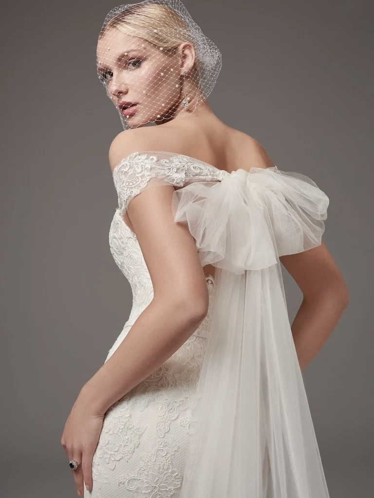 This stunning off the shoulder cap sleeve ties in the back to create a statement bow. Gorgeous.
