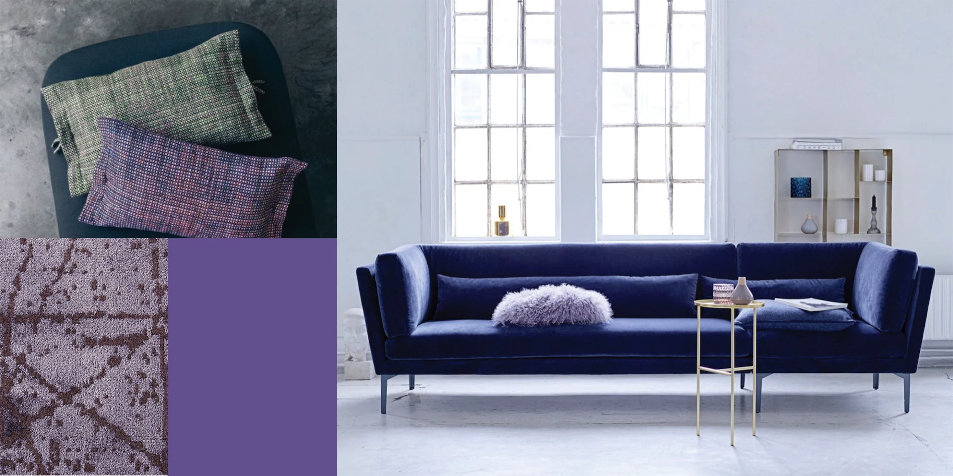 CLOCKWISE FROM TOP LEFT Accent cushion, Muuto. The Rox sofa in soft velvet, Bloomingville. Pantone Colour of the Year 2018 Ultra Violet 18-3838. Calvin Klein’s Maya Orchid rug, Houseology.